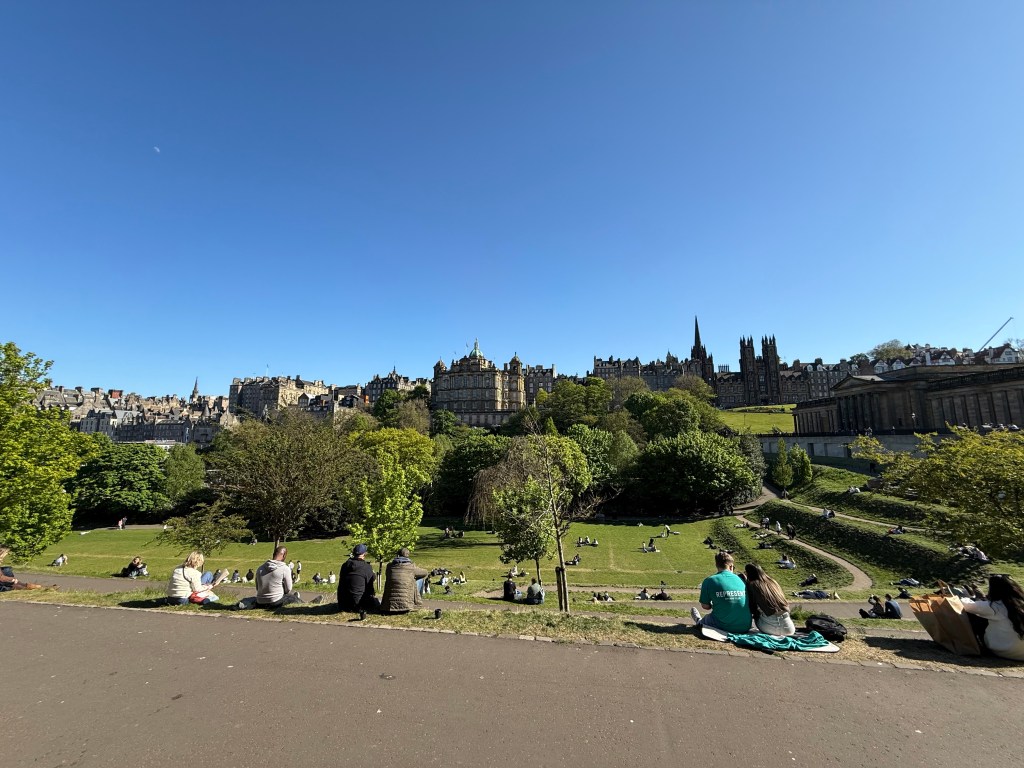 Stepping onto Princes Street felt like walking straight into the heartbeat of Edinburgh. The moment we emerged from the station, the city opened up in front of us — the castle towering dramatically above, the gardens stretching out below, and the buzz of people, buses, and bagpipes filling the air. Edinburgh has this electric mix of old‑world charm and modern city life, where you can shop at high‑street stores while staring at centuries‑old stone walls perched on volcanic rock. It was the perfect first impression: lively, scenic, and unmistakably Edinburgh.